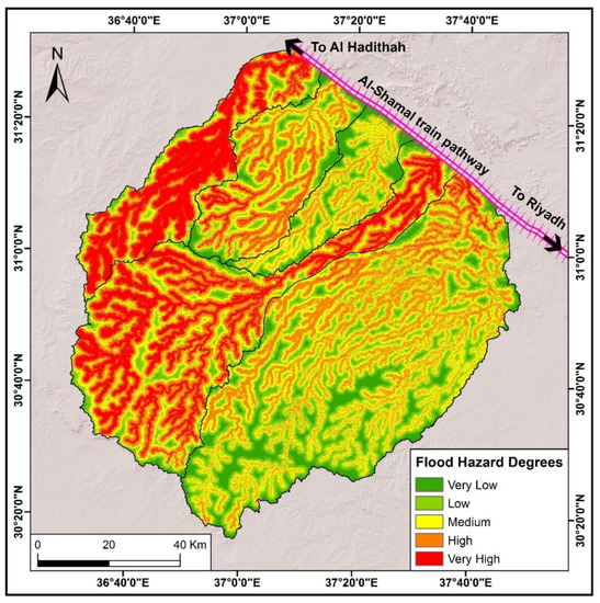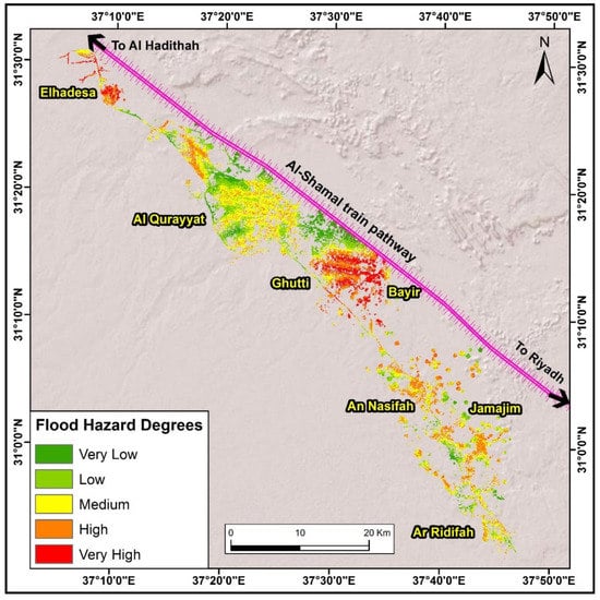 The main aim of this scientific research was to carefully study and inspect the flood hazard in the study area after the construction of the Al-Shamal train pathway in 2017 near the cities and villages of Al-Qurayyat, considering that there were several historical flooding events in the study area which flooded urban communities close to the train pathway, producing significant damage to lives, property, and infrastructure. Thus, the flood hazard map presented in this study can help in developing an appropriate strategic solution by the responsible authorities and policymakers, shedding light on the hot-spot flood areas in order to mitigate and reduce the hazard.