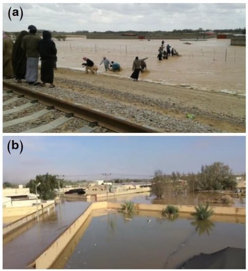 The flow of these wadis have severe negative impacts, resulting in the occurrence of frequent annual floods. Table 1 presents the records of historical flooding events which occurred in the study area. The floods that occurred on 10 November 2018 were the most severe, which resulted in halting traffic completely, the flooding of houses and schools, and the partial destruction of Al-Qurayyat hospital. The Ghati, Bayer, and Hadithah villages were flooded and their people were displaced, as can be seen in Figure 1.