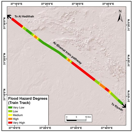 Degrees of flood hazard on the Al-Shamal train pathway in the study area in 2020.