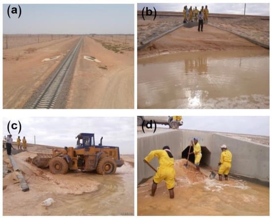(a) Part of the Al-Shamal train pathway; (b) the existing structures under the train pathway which are blocked by Wadi Bayer floodwater sediments in front of the train pathway; and (c,d) the process of removing sediment from under the Al-Shamal train pathway.