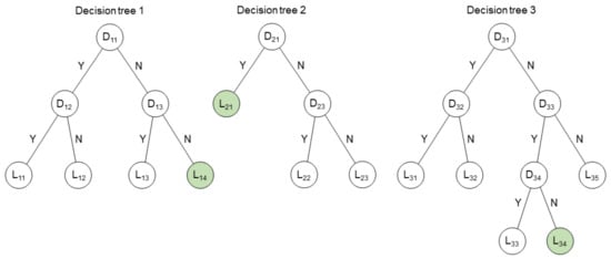Instead of one single decision tree, GBDT methods use an ensemble of many decision trees that result in a communal prediction. An example of an ensemble of decision trees with a maximum depth of 3 is shown in Figure 1. The underlying principle is that combining large numbers of weak predictors can make for a strong predictor. Subsequent trees are iteratively added to the ensemble, trying to correct for prediction errors of previous trees. The final answer of the ensemble of trees is the sum of all predictions of the individual trees (the green leaf nodes in Figure 1), accounting for the learning rate (see Section 3.1). The total number of trees within the ensemble can either be set at the start of training, or use can be made of an ‘early stopping’ algorithm, which is explained in more depth in Section 3. In this paper, the GBDT implementation used is XGBoost [] (XGB) as a package in Python [].