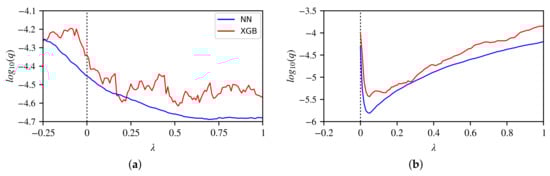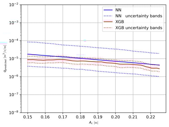 From Figure 2 it is evident that for an increasing crest freeboard (), the overtopping discharge is expected to decrease. Figure 5a shows that this indeed is the general trend. The XGB model, however, shows non-smooth behaviour that locally causes increases in discharge with increasing freeboard. Figure 5b shows that, as expected, the wave overtopping discharge decreases with an increasingly oblique angle of wave attack. However, where the NN is reasonably smooth, the XGB model does not predict a smooth decrease of the wave overtopping discharge, but rather shows a staircase pattern. Both the staircase pattern for wave obliquity and the non-smooth behaviour for the freeboard are inherent traits of GBDT methods. Since the method is based on an ensemble of CARTs, it features many discrete splits in regression trees. This leads to the discontinuous behaviour seen in Figure 5. The size and density of the discontinuities in the model’s predictions depend in large amount on both the number of trees and number of data points along the axis of interest. For instance, there are relatively few data points with a (11.5% of the training data), so given that q decreases with increasing , this will inevitably result in the discrete staircase behaviour observed in Figure 5b. An abundance of data points along the axis of interest allows GBDT methods to distinguish with higher resolution between different values of a certain feature. Hence, it is a requirement, but not a guarantee for smooth behaviour. Methods that allow for locally optimized fits—such as GBDT—can result in variations around a general trend. This is exhibited in Figure 5a. Note that, while non-smooth model behaviour is in principle not desirable, it might be a worthwhile tradeoff if the model predictions are more accurate on the whole.