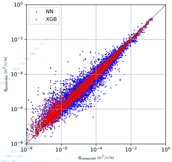 The measurements from the database and the predictions thereof by the NN and the XGB model (median) are mutually compared through scatter plots, see Figure 4. The smaller RMSE for the XGB model can be recognized from the smaller spread in the red points around the diagonal (i.e., better predictions) than the spread in the blue points. The red points belonging to m/s/m show noticeably larger deviations from the measurements, which is a reflection of the lowering of the for those points, as described in Section 2.2.