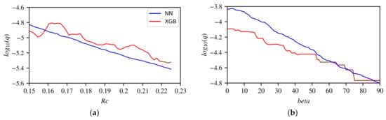 To assess the physical realism displayed by the XGB model, the results along one line segment varying a single feature are plotted versus the log of the wave overtopping discharge. To this end, 1288 data points for realistic reference situations have been synthesized, two examples of which are further discussed and shown in Figure 5 with feature values listed in Table 5. For comparison, the results from the NN are also plotted. Note that both lines show model behaviour, but neither represents an objective truth.