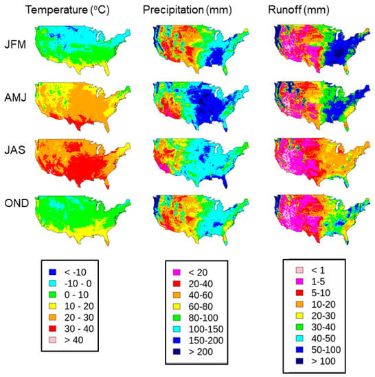Baseline (1981–1999) climatic conditions for seasonal average monthly temperature in degrees Celsius (°C), precipitation in millimeters (mm), and runoff in mm. JFM, January–March; AMJ, April–June; JAS, July–September; OND, October–December.