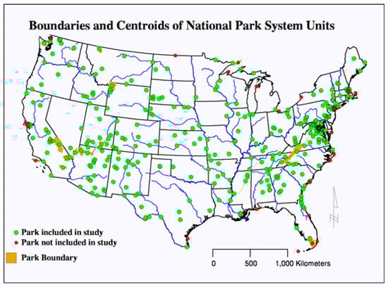 Map showing boundaries and centroids of national parks in the conterminous United States that were (and were not) included in this study.