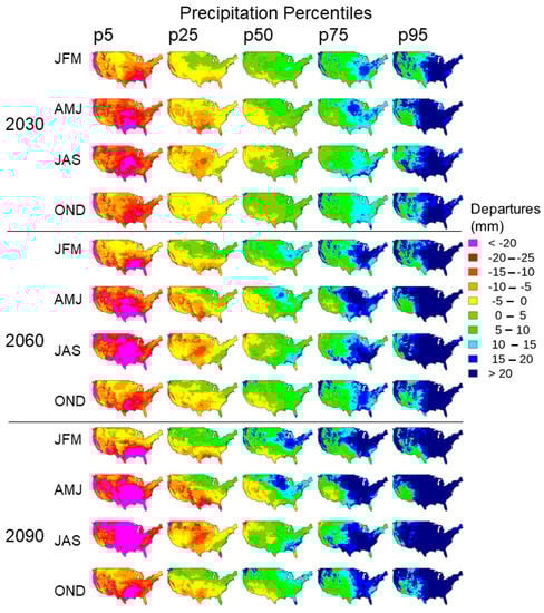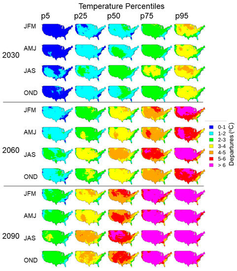 Figure 3, Figure 4 and Figure 5 show the departures of T, p, and R from the historical GCM baselines [17]. These departures as shown by model output percentile for 2030, 2060, and 2090 and are mapped to illustrate the spatial distributions of changes from the 214 climate simulations. T increases for all percentiles and for all periods (2030–2090, Figure 3). For most seasons and periods, there also seems generally to be greater warming in the interior CONUS compared with coastal regions. By 2030, the 50th percentile T departures are between 1 and 3 °C, with the 5th percentile departures between 0 and 2 °C, and the 95th percentile departures between 3 and 5 °C. By 2060, the 50th percentile T departures are larger than 3 °C, with the 5th percentile departures between 0 and 3 °C, and the 95th percentile departures larger than 5 °C for most of the CONUS for all seasons. By 2090, the 50th percentile T departures are generally 4 °C or larger, with the 5th percentile departures generally between 1 and 3 °C, and the 95th percentile departures larger than 6 °C for much of the CONUS for all seasons.