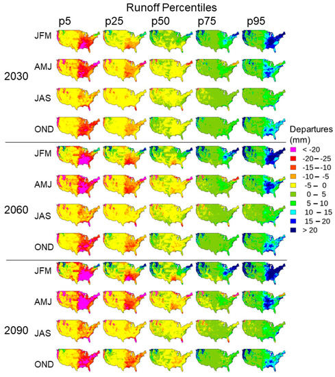 Departures in seasonal average monthly runoff in millimeters (mm) by percentiles (5th, 25th, 50th, 75th, and 95th) projected for 2030, 2060, and 2090 from 214 climate simulations. JFM, January–March; AMJ, April–June; JAS, July–September; OND, October–December.