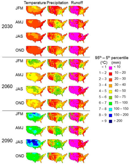 Range (95th percentile − 5th percentile) of departures in seasonal average monthly temperature in degrees Celsius (°C), and precipitation and runoff in millimeters (mm) projected for 2030, 2060, and 2090 from 214 climate simulations. JFM, January–March; AMJ, April–June; JAS, July–September; OND, October–December.