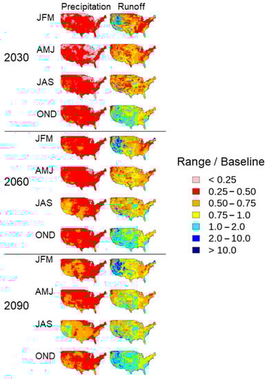 Range (95th percentile − 5th percentile) of departures divided by the baselines in seasonal average monthly precipitation and runoff projected for 2030, 2060, and 2090 from 214 climate simulations. JFM, January–March; AMJ, April–June; JAS, July–September; OND, October–December.