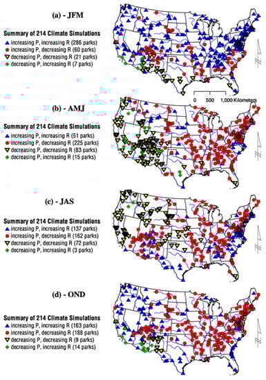 Summary of 214 general circulation model (GCM) climate simulations for 2030 showing where the 50th percentile projections of departures in average monthly precipitation (p) and runoff (R) are increases or decreases for each national park and the number in each category for: (a) January–March (JFM); (b) April–June (AMJ); (c) July–September (JAS); and (d) October–December (OND).