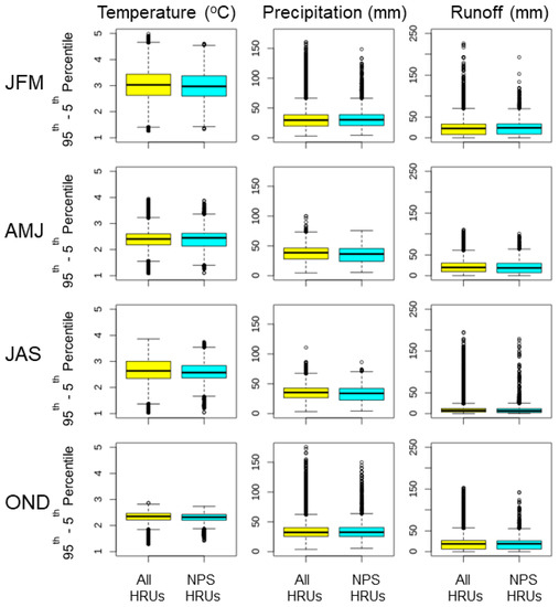 Boxplots comparing projected ranges (95th percentile − 5th percentile) of departures in seasonal average monthly temperature in degrees Celsius (°C), precipitation in millimeters (mm), and runoff in mm projected for 2030 from 214 climate simulations, for all HRUs in the CONUS (yellow) with only HRUs in national parks (NPS; cyan). HRU, Hydrologic response unit; JFM, January–March; AMJ, April–June; JAS, July–September; OND, October–December. The shaded boxes show 25th–75th percentile of projected ranges. The line across the box shows the median projected range. The whiskers extend to the largest value that is less than the 75th percentile value plus 1.5 times the interquartile range (75th percentile–25th percentile) and to the smallest value that is greater than the 25th percentile value minus 1.5 times the interquartile range. Outliers are shown as circles.
