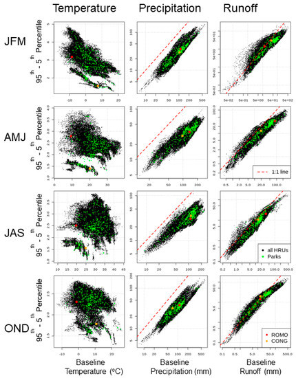 Comparison of baseline conditions to projected ranges (95th percentile − 5th percentile) of departures in seasonal average monthly temperature (°C), precipitation (mm), and runoff (mm), projected for 2030 by 214 climate simulations, for all HRUs in the CONUS (black dots), and for national parks in the CONUS (green dots). Note that x-axis and y-axis scales can vary by season and a log scale is used on the y-axis for the precipitation and runoff plots. HRU, Hydrologic response unit; JFM, January–March; AMJ, April–June; JAS, July–September; OND, October–December; CONG, Congaree National Park; ROMO, Rocky Mountain National Park.