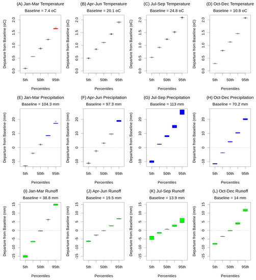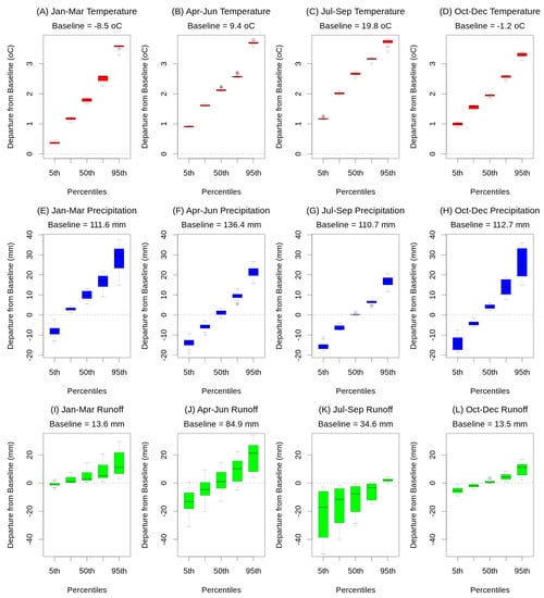 For each MWBM variable (T, p, and R), each season (JFM, AMJ, JAS, and OND), and each period (2030, 2060, and 2090), the 5th, 25th, 50th, 75th, and 95th percentiles of T, p, and R departures for the 214 climate simulations were computed for each of the 109,951 HRUs [17].