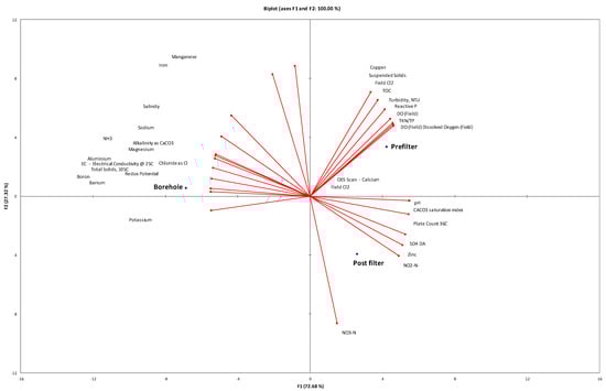 Principal component analysis of three types of water: Borehole, Pre- and Post-filter. Measurements for carbonate and hydroxide alkalinity as CaCO3, Arsenic, Beryllium, Cadmium, Chromium, Cobalt, Lead, Mercury, Nickel and Vanadium were below the detection limit for the three types of water.