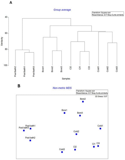 Such characterization allows us to know the original microbiome in an Australian hot spring and compare it to similar hot springs throughout the world, as well as evaluate the presence of pathogens in this system and observe the changes in microbial diversity driven by physicochemical changes (temperature, dissolved oxygen, chlorine addition and pH). The result of the Bray Curtis similarity and NMDS revealed that the microbial diversity in each of the waters is distinct and indeed affected by the physicochemical factors (Figure 3).