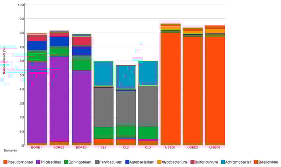 The total chlorine concentration increases from 0 in the borehole to 0.81 mg/L in the pre-filter water to below 0.05 mg/L in the post-filter water (Table 1). The presence of chlorine is likely to have a significant effect on the microbial community. The pre-filter water with a final chlorine concentration of 0.2 mg L−1 was found to be dominated by Sphingobium, Parvibaculum and Achromobacter, followed by Pseudomonas and Halothiobacillus (Figure 4).