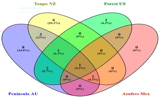 Hot springs can be generally categorized in two groups: acid springs and those neutral or slightly alkaline springs []. PHS falls in the neutral group. We aimed to compare the microbial diversity in PHS to others around the world with similar temperature (44 to 50 °C) (regardless of pH). The Volcanic Taupo hot spring in New Zealand, the Forest springs in California and the hot spring in Los Azufres, Mexico, have similar temperatures to the PHS. Proteobacteria is the common phylum among the four hot springs (Figure 5). Firmicutes is common to PHS, Taupo and Forest springs while Chlorobi is common to PHS, Taupo and los Azufres.