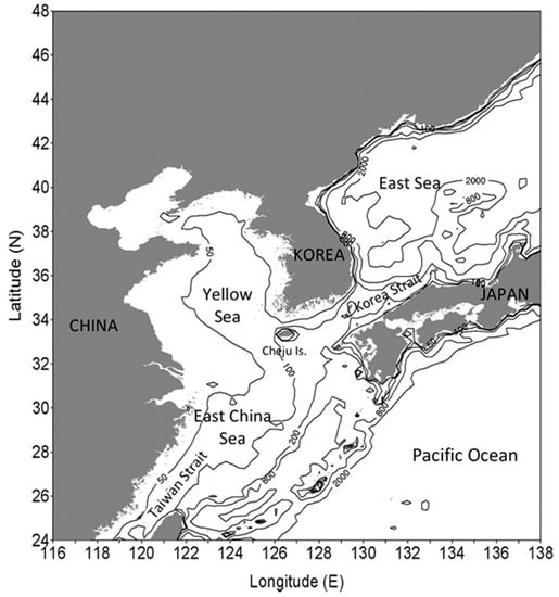 The Yellow Sea (YS) is located between the mainland of China and the Korean Peninsula, and its depth is about 44 m on average, with a maximum depth of 152 m. The sea bottom slope gradually rises toward the East China coast and more abruptly toward the Korean Peninsula, and the depth gradually increases from north to south. Southern YS is bounded by the East China Sea (ECS) along a line running northeastward from the mouth of the Changjiang River to the southwestern tip of Korea. ECS covers the area originating around the Taiwan Strait at about 25° N, extending northeastward to the Kyushu Island, Japan, and to the Korea Strait, and bounded by the Ryukyu Island chains on the southeastern open ocean (Figure 1). On the broad and shallow shelf under the Yellow and the East China Sea (YECS), the flow is dominated by strong semidiurnal M2 tidal currents with the superimposition of semidiurnal S2, diurnal K1 and O1 currents [,,,]. Approaching the WCK, the tidal amplitudes vary from 4 to 8 m, and the speed of the tidal current may increase to more than 1.56 m/s near the coasts.