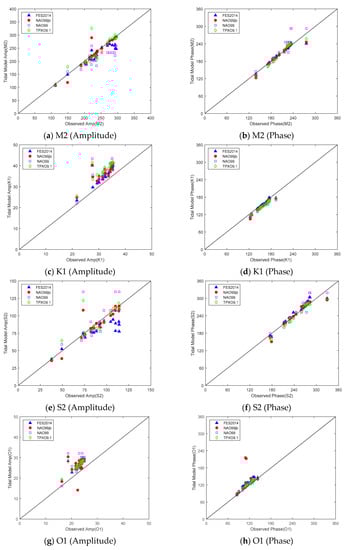 Validation of amplitudes and phases obtained from assimilated tidal models (FES2014, NAO99Jb, NAO99 and TPXO9) against observed data at tidal gauges; (a): M2’s amplitude, (b): M2’s phase, (c): K1’s amplitude, (d): K1’s phase, (e): S2’s amplitude S2, (f): S2’s phase, (g): O1’s amplitude, (h): O1’s phase.
