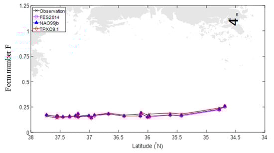 Figure 3 shows the values of the form number along the WCK are below 0.25 according to the data obtained from observation at 21 tidal gauges, as well as from three assimilated tidal models, FES2014, TPXO9.1 and NAO.99Jb; therefore, the mixed tide prevails semidiurnal in the WCK.
