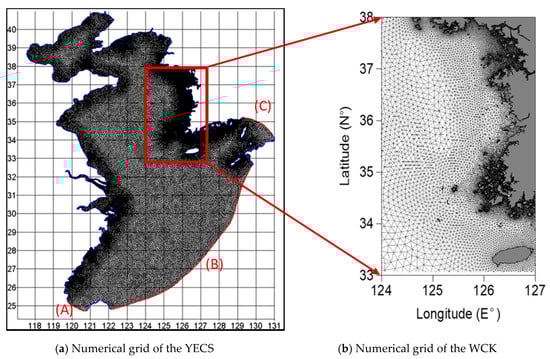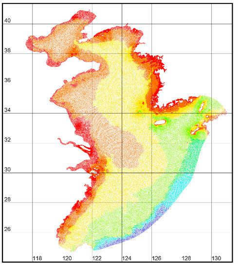 In this study, the numerical simulation applied a hybrid horizontal resolution of an unstructured grid using a free pre-processing Blue Kenue software tool (https://nrc.canada.ca/en/research-development/products-services/software-applications/blue-kenuetm-software-tool-hydraulic-modellers). Herein the unstructured triangular grid had a horizontal resolution varying from 0.2 to 1 km in the WCK, 3–5 km in the East coast of China, and 9–12 km in the interior of YS and ECS. After running a number of simulations to check for grid independence, the final grid of 203,927 grid cells was used for the simulation in this study. Bathymetry was interpolated to each nodal point of the horizontal grid using Blue Kenue software as well (Figure 5).