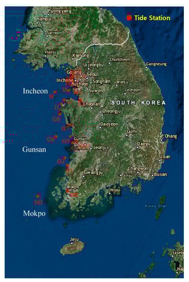 A total of 21 tidal gauges were collected around the WCK to provide the observed tidal elevation data of semidiurnal M2 and S2 and diurnal K1 and O1 constituents in YECS. As shown in Figure 6, the WCK can be divided into three sub-regions based on the common characteristics of their bathymetry and coastlines—the first region was Kyunggi Bay near Incheon (I), the second region was around the estuary of the Geum River near Gunsan (G), and the third region was around the south-western tip near Mokpo (M). The numbers of tidal gauges located in three regions Mokpo, Gunsan and Incheon were 2, 8 and 11, respectively. The most recent observation data in 2017 downloaded from Korea Hydrographic and Oceanographic Agency (http://www.khoa.go.kr/koofs/kor/observation/obs_real.do) have been selected for the calibration and validation of numerical models.