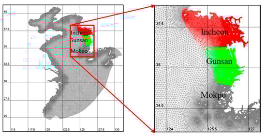 The WCK was divided into three different sub-regions—Mokpo (M), Gunsan (G), and Incheon (I)—as shown in Figure 7, for applying different bottom friction coefficients. The borderline of this sub-regions was set based on a water depth contour of around 50 m. Different values of bottom friction coefficient were applied with regards to the geographic characteristics.