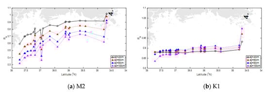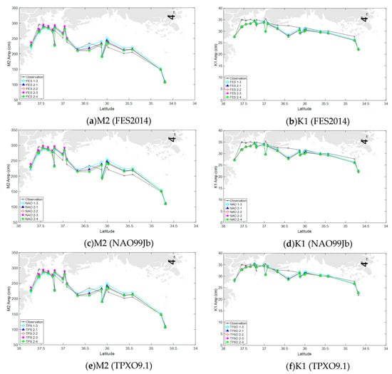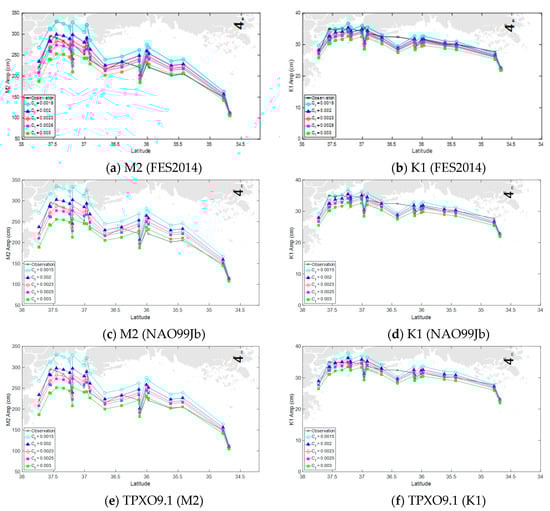 Previous tidal calculations in the YECS region were mostly using the quadratic bottom friction law, in which the typical value of roughness coefficient was chosen as a uniform value of 0.0025, as shown in [,,,]. We again have verified the numerical model with various uniform roughness coefficients that ranged from 0.0015 to 0.03 for different offshore open boundary conditions (OBCs) interpolated from three assimilated tidal models (FES2014, TPXO9.1 and NAO.99Jb).