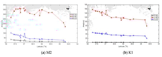 As mentioned in Section 2.2 above, the modeling region has been bounded by three different open boundaries; A, B and C, as shown in Figure 3. Averaged tidal amplitudes at each boundary A, B and C obtained from three tidal models are shown in Table A10, in which the nodal boundary amplitudes are averaged with weighting by the length of each segment of boundary cells. The tidal amplitudes along the boundary A were significantly larger than the values along the boundaries B and C. Particularly, the tidal amplitude of M2 along the boundary A were larger than the values along the boundaries B and C; about 3.3 times and 9.3 times, respectively. The tidal amplitudes at the boundary C were the smallest because when the tides propagated from the deep region of the East Sea (its depth was about 2000 m) through boundary C via the shallow region at the Korea Strait (its depth was less than 80 m), the tidal amplitudes were significantly damped due to shoaling process on this shallow shelf region.
