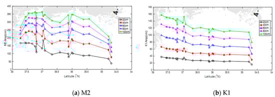 In addition, Figure 11 also shows that once the tidal amplitude of M2 at boundary B was about 20 cm, the resultant amplitudes propagated within Kyunggi Bay had little different tendencies in comparison with those obtained from the amplitude larger than 20 cm, since it was not remarkably damped.