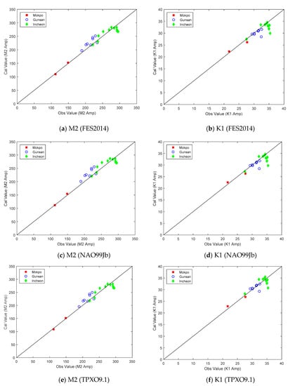 As shown in Table A2, Table A3 and Table A4 (in Appendix A), based on the evaluation of root mean square deviation (RMSE) of tidal amplitudes between the observation and the numerical results obtained from applying various uniform roughness coefficients, the results show that the numerical results were very distinct from each other. For the tidal constituent M2, the bottom roughness coefficient Cf = 0.0023 provides the best result obtained from FES2014 and TPXO9.1, while the numerical results obtained from NAO99Jb were not significantly different between Cf = 0.0023 and 0.0025. For the tidal constituent K1, the bottom roughness coefficient Cf = 0.002 provides the best result obtained from NAO99Jb, while the numerical results obtained from FES2014 were not significantly different between Cf = 0.0015 and 0.002; the numerical results obtained from TPXO9.1 were not significantly different between Cf = 0.002, 0.0023 and 0.0025. For the tidal constituent S2, the bottom roughness coefficient Cf = 0.0015 provides the best result obtained from all three assimilated tidal models. For the tidal constituent O1, the bottom roughness coefficient Cf = 0.0015 provides the best result obtained from FES2014 and TPXO9.1, while the numerical results obtained from NAO99Jb were not significantly different between Cf = 0.0015 and 0.002. In addition, based on the RMSE values in Table A2, Table A3 and Table A4, the results show that for M2 the most appropriate roughness values for Mokpo, Gunsan and Incheon regions were 0.0025, 0.003 and 0.0023, respectively. Whereas, for S2, the most appropriate roughness values for Mokpo, Gunsan and Incheon regions were 0.002, 0.0023 and 0.0015, respectively. For O1, the most appropriate roughness value for Mokpo, Gunsan and Incheon regions was 0.0015 and for K1 the most appropriate roughness values with FES2014 and NAO99Jb for Mokpo, Gunsan and Incheon regions were 0.0015, 0.002 and 0.002, respectively. However, with TPXO9.1 the values for Mokpo, Gunsan and Incheon regions were 0.002, 0.0023 and 0.002, respectively.