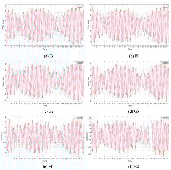 The bottom friction coefficient is a physical parameter characteristic of bottom materials and bathymetries. Therefore, it cannot vary following each tidal constituent. From Table A5, Table A6, Table A7, Table A8 and Table A9, an acceptable selection from all test cases, which can deliver reasonable results for all tidal constituents (M2, K1, S2 and O1), was the case name “FES/NAO/TPX 2-4” whereby the bottom friction coefficient Cf took a value of 0.0025 for the Mokpo region, 0.0035 for the Gunsan region, and 0.002 for Incheon and other regions. These values are in the range suggested by [,] applying also for four tidal constituents (M2, K1, S2 and O1).