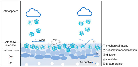 In the low-accumulation and cold regions in Antarctica, post-depositional processes, including mechanical mixing, sublimation and re-condensation, molecular diffusion, ventilation, and metamorphism (Figure 1), play an important role in the modifying of the original isotope signal of the upper snow layers [11,12,13]. In mechanical mixing, strong winds can scour and erode the snow layer to form snowdrift. The shifted snow can be transported to deposit at a new location. Thus, the δ are likely to be modified by mechanical mixing between blowing snow and snowfall [14]. Sublimation and re-condensation cycles are defined as water phase changes between vapor and snow at the air–snow interface, which can cause an exchange between upper snow isotope content and mass [15,16]. Molecular diffusion is the random movement of water molecules in the vapor phase. This process occurs in pore-space and intra-ice-grain within firn. Both cases can lead to smooth the high-frequency variations of water isotope records, but the magnitude of transportation within the matrix of the ice grains is lower by a rate of several orders [17]. Wind-driven ventilation can carry atmospheric water vapor into the snow where it mixes with the vapor in the pore space, resulting in annual mean δ18O enrichment [18]. Metamorphism corresponds to the coarsening of the snow grains as a result of temperature gradients in the firn [13]. Its impact may cause the surface snow to retain the enriched summer isotopic composition of precipitation. In combination with all the above processes after deposition, an apparent cycle of 20 cm by counting the isotopic maxima are shown in snow pits from several East Antarctic interior sites, instead of the annual cycle [19].