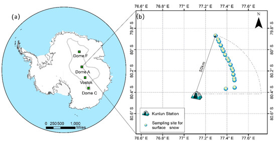 Surface snow sampling has been performed during the Chinese inland Antarctic expedition [23,24,25,26,27,28,29]. During sampling at each site, the topmost 3 ± 1 cm layer was collected in a randomly flat area. This depth corresponds to the 3–6 months of past net accumulation (20–40 mm w.e. year−1) at interior sites. Among the previous observations, we choose the data points located within 50 km of KL as the local variability of water stable isotopes in surface snow (Figure 2b). This selection finds a balance between the number of data and the representatives of local features at Dome A. In total, there are 18 data points obtained from the 2010/2011, 2012/2013 and 2014/2015 field seasons.