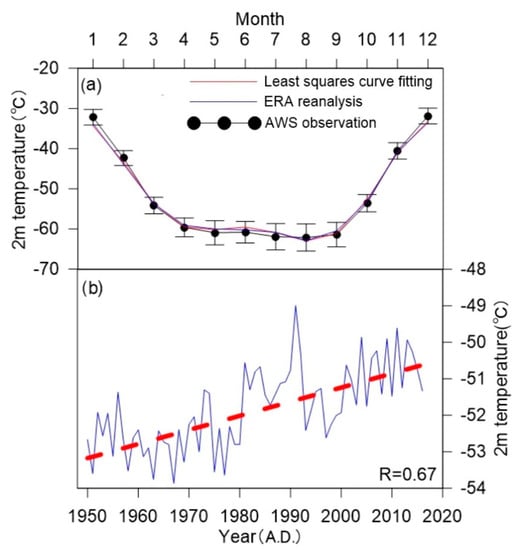 From the AWS records, the annual mean T2m is −52.07 °C. However, this result was insufficient to compare with the water isotopic profile in the snow pit. To extend the temperature variations to a longer period, we retrieve the annual T2m from ERA-20c and the ERA-interim reanalysis dataset with a 1° × 1° grid resolution, during the period of 1950–2016. In the past 66 years, the T2m from ERA reanalysis data shows an increasing trend, with an average of −51.80 °C (Figure 3b). Compared with the instrumental data, there is a small difference of 1.0 °C for the reanalysis dataset over the period of 2005–2011. The agreement indicates that the outputs from the ERA reanalysis dataset are reliable for local temperature variations. Thus, the annual mean temperature from the ERA reanalysis dataset can be used to compare with stable isotopic composition in snow pits.