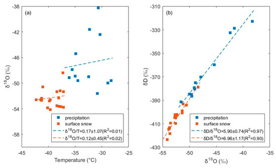In addition, the slope (δD/δ18O) of the Local Meteoric Water Line (LMWL) in summer precipitation is lower than that in surface snow (Figure 4b). The influence of sampled snow possibly including parts of non-summer snow could explain the difference, since the δD/δ18O slope of non-summer snow is higher than that of summer snow at other Antarctic interior sites [26]. The increase in the δD/δ18O slope in non-summer snow cannot be independently caused by a distillation process, considering that the previously modeled δD/δ18O slope at Dome A (7.62) is much higher [26]. Thus, the isotopic modification from post-depositional processes may also account for the differences in the δD/δ18O slope between summer precipitation and surface snow.