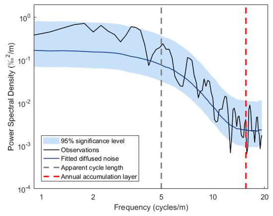 Power Spectra Density of the δ18O variations in the Dome A snow pit. The dark blue line and light blue area show the power spectral density (PSD) of diffused white noise plus measurement noise and confidence bound of the 95% critical significance level, respectively. The grey and blue dashed lines verticality correspond to the frequency of the apparent cycle found in the snow pit and the theoretical cycle of the annual layer, respectively.