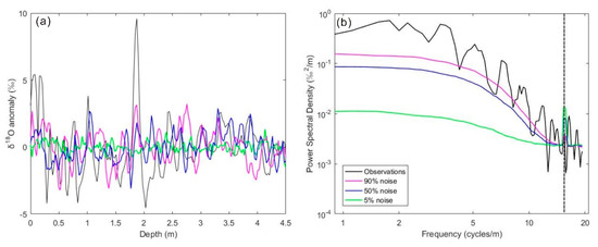 The average PSD of high signal-noise ratio case is deviated from the spectra of the actual signal, especially at the frequency range higher than 10 cycles/m. The PSD curve of the mixed input case (blue line in Figure 8b) also has an offset from the actual signal, but the deviation is smaller than that in the high signal–noise ratio case. In contrast, the low signal–noise ratio case (pink line in Figure 8b) is basically consistent with the PSD of the actual signal. The variation in these three cases confirms that the δ18O signal in the snow pit is mainly composed of noise. Note that there is a clear peak corresponding to the annual year thickness in each simulated case (vertical line in Figure 8b). Moreover, the magnitude of peak in high signal–noise ratio case is larger than that in the spectra of low signal–noise ratios. This difference could result from the strong effect of diffusion on the seasonally dominated fraction of the δ18O signal.