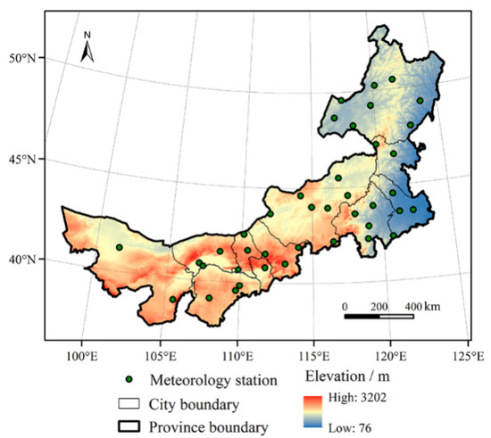 The elevation and distribution of meteorological stations in Inner Mongolia.