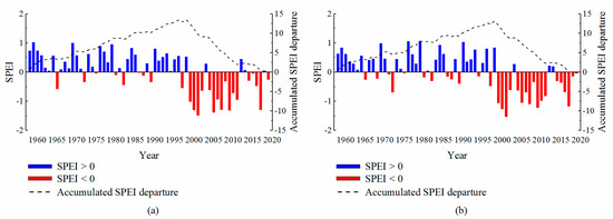 The Thiessen polygon method is applied to get the overall SPEI values of the study area. Overall, from 1958 to 2019, Inner Mongolia experienced a wetter period, followed by very frequent droughts. Figure 2a shows the change of the annual SPEI in Inner Mongolia. The SPEI-12 in December can be used to characterise the annual droughts. As it can be seen, the SPEI value shows a clear drop, since 1997. The SPEI values of most years from 1958 to 1996 are positive; only the SPEI value of 1965 is less than −0.5 (referred as mild drought). After 1996, the SPEI values are almost all negative. During the last 23 years (i.e., from 1997 to 2019), only the SPEI values in 1998, 2003, 2012, 2013, and 2018 are positive. As observed from the SPEI cumulative curve, the cumulative value of SPEI shows a general upward trend before 1997, reaching a maximum value of 13.47 in 1996, followed by a downward trend. According to the change of the SPEI values, the frequency of drought began to increase near 1997, experiencing a dramatic change.