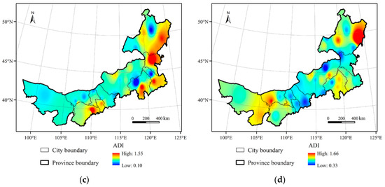 The spatial distribution of ADI values in (a) spring, (b) summer, (c) autumn, and (d) winter.