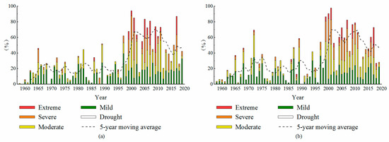 The changes in the proportion of drought area in (a) annual and (b) plant growth period, over the years.