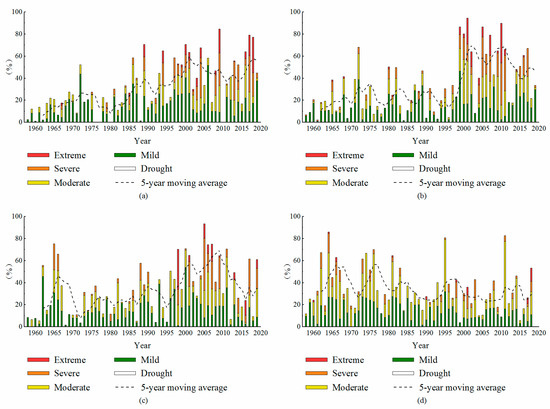 Figure 6b and Figure 7 demonstrate the interannual changes in the proportion of the drought area in the plant growth period and all seasons, in which, the changes of the plant growth period and the annual are basically the same. While, the changes of drought area in each season has its own characteristics with an overall increasing trend in the spring, summer, and autumn, with the expansion of the severe and extreme drought areas. The summer, autumn, and winter seasons show the characteristics of regional droughts for consecutive years, with occurrence of regional droughts every year from 1958 to 2019. In spring, the increase in drought area is relatively uniform, with no obvious catastrophic year. The summer drought area suddenly increased in 1999. The drought area during the period between 1999 and 2019 has significantly increased, compared to the previous period, meanwhile, the drought area has declined since 2010. The drought area in the autumn shows an overall increasing trend from 1958 to the 2000s, except the unusually considerable increase in 1962, 1965, and 1966, as well as a downward trend after 2010, which is the same as that in summer. The overall drought area in the winter shows a slight downward trend. However, the drought area in 1995 and 2011 shows unusually great increase, both exceeding 80%. The drought types are mainly dominated by the mild and moderate drought.