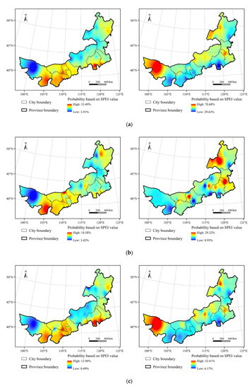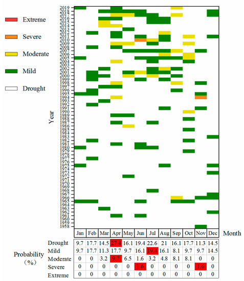 In this study, the intra-annual distribution of drought in Inner Mongolia is analysed using the SPEI values on a 1-month scale (Figure 8). As presented, the frequency of droughts is low before 2000, including mainly the mild droughts. Among the 504 months from 1958 to 1999, only six months show the moderate droughts and one month has a severe drought, with no extreme drought. Since 2000, the drought frequency has increased, with more concentration in March–October. The drought types are mainly dominated by the mild drought and the moderate drought, and only one month has experienced severe drought, with no occurrence of the extreme drought. According to the frequency of drought in each month, the frequency of drought in April shows the highest value of 27.4%, while, the drought in January is recorded at its lowest value of 9.7%. According to the drought types, July is the month with the highest frequency of mild drought at 19.4%, April is the month with the highest frequency of moderate drought at 9.7%, while, June and November are the months with the highest frequency of severe drought at 1.6%. The three months of winter (i.e., December–February) are characterised by occurrence of only mild droughts. According to the pattern of drought occurrence in different months, corresponding drought resistance measures should be formulated. For instance, drought-relief workers should be prepared to prevent mild drought impacts in winter, such as applying for a small amount of transferring water.