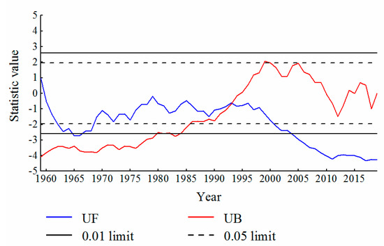 The Mann-Kendall trend test is a non-parametric statistical test [47,48], with no requirement for the sample to follow a certain distribution and is not disturbed by a few outliers. In this study, the MK test is used to analyse the change trends and mutation-points of drought and the climate conditions of the study area.