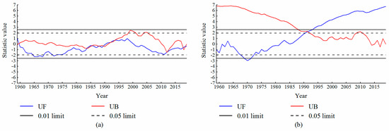 The M-K test results of (a) annual average precipitation, and (b) annual average temperature.