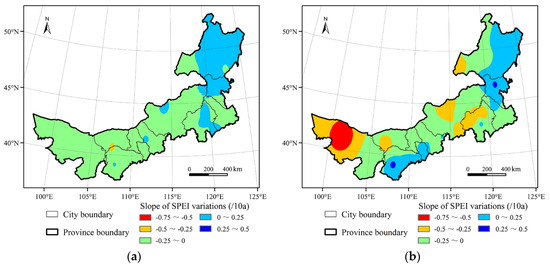 In order to further analyse the spatial change of drought in Inner Mongolia before and after the abrupt change of climate conditions, the change trend of the SPEI value at each station is calculated in time intervals, and the inverse distance weighted interpolation method is used to obtain the change trend in the entire study area (Figure 11). Due to occurrence of the abrupt climate change in 1993, the time period is divided into 1958–1992 and 1993–2019. It should be noted that the time period is divided according to the change point of sudden climate change and the figure represents the spatial variation of the SPEI in the two periods, not the spatial drought severity. As shown in Figure 11, before the abrupt change of climate, the eastern regions mostly show a humid trend, while most of the western and central regions show a weak drought trend. However, after the abrupt change of climate, the western regions show a very strong drought trend. Meanwhile, a small part of the central regions show a strong drought trend, the southwest of the central region experiences a weaker humid trend, and the other central regions show a weak drought trend. The humid area in the eastern region still occupies a large area, a few areas indicate a strong drought trend, while, the drought trend is weak at the remaining areas.
