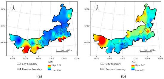 The spatial distribution of ADI values in (a) 1958–1992 and (b) 1993–2019.