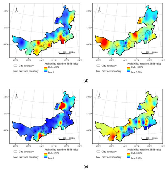 The spatial distribution of (a) drought, (b) mild drought, (c) moderate drought, (d) severe drought, and (e) extreme drought, in 1958–1992 (left-hand side), and 1993–2019 (right-hand side).